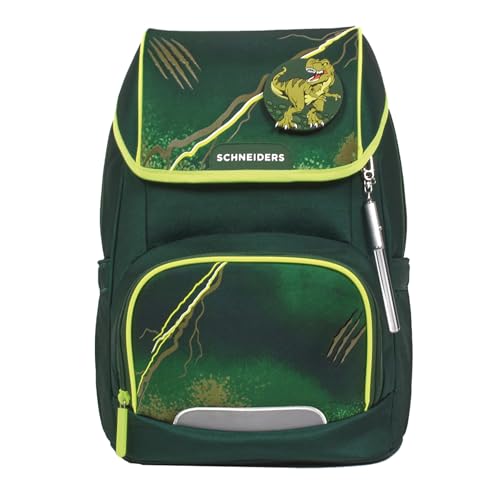 Schneiders 78455-065 – 6-teiliges Schulranzen-Set Ergojet Dino Olive mit Turnbeutel, Federmappe, Schlamperrolle und individuellen Patches, ergonomischer Rücken und Reflektoren, ca. 21 l Volumen
