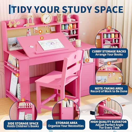 Schreibtisch Kinder mit Stuhl, Schülerschreibtisch mit Neigbarer Schreibtisch für Kinder mit Offenen Regale & Bücherregal & Ablage, Kinderschreibtisch für Jungen und Mädchen ab 3 Jahren, Rosa