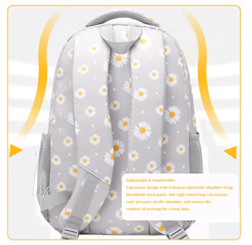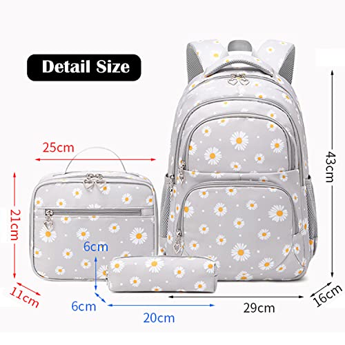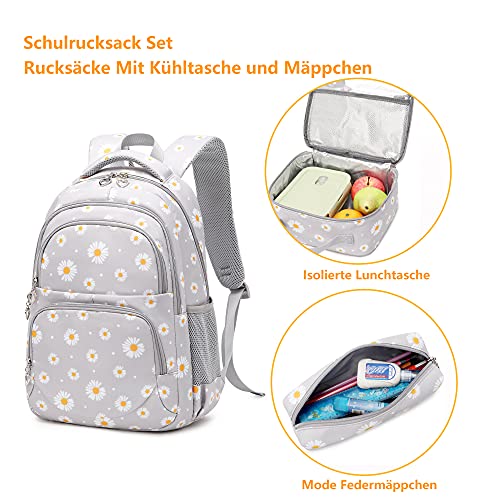 Schulrucksack Mädchen Teenager Damen Schultasche Canvas Schulranzen Set Blumen Rucksack für Mädchen Schule Freizeit mit Lunchpaket Tasche und Mäppchen (3 in 1 Grau)