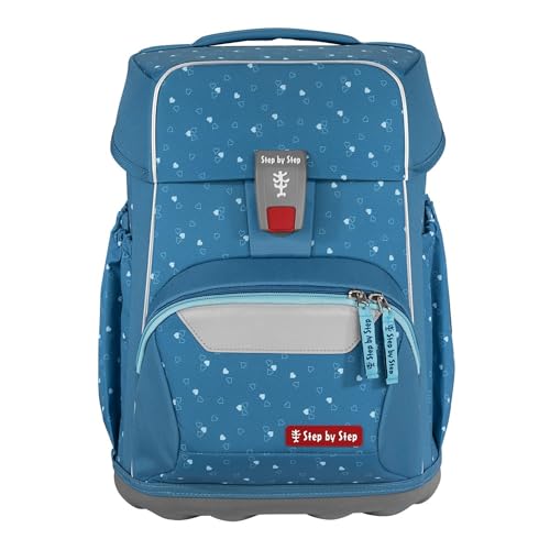 Step by Step Basis Schulranzen-Set „Blue Hearts“, 4-teilig, blau, ergonomischer Tornister mit Reflektoren, Hüft- und Brustgurt, für Kinder ab der 1. Klasse, 20 Liter