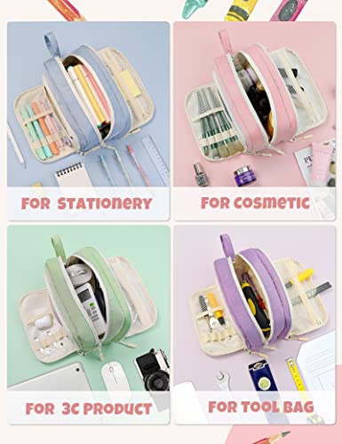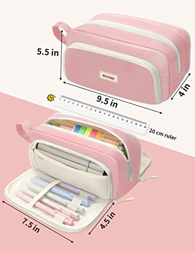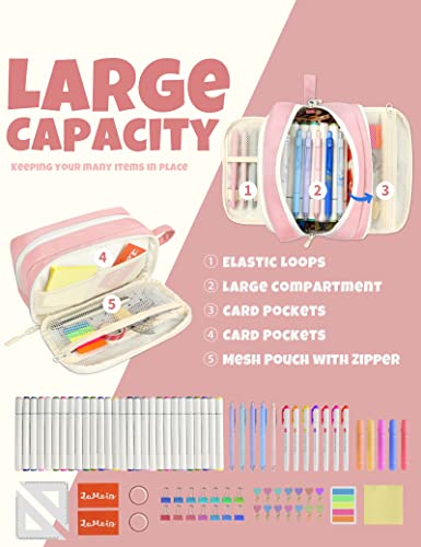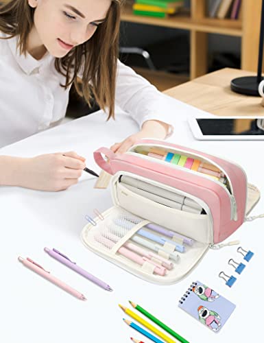 SUNEE Niedliches Federmäppchen, ästhetisches Stifteetui mit 3 Fächern, Kawaii-Buntes, großes Federmäppchen mit Reißverschluss, Schreibwaren-Aufbewahrung und Organizer, rosa Schulbedarf für Teenager