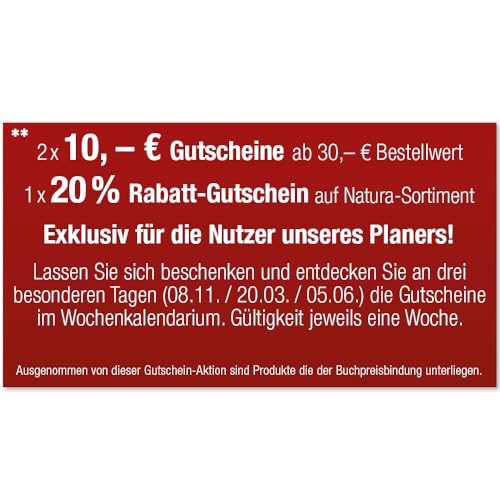• ** Dieser Planer enthält 2 x 10 €-Gutscheine = 20 € Gesamtwert. Gilt jeweils ab einem Bestellwert von 30 € in den Aktionszeiträumen vom 08.11. – 15.11.2025 bzw. vom 20.03. – 27.03.2026.