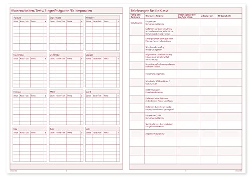 • Ganz am Schluss zusätzlich 9 Seiten für Notizen, je 1 Seite wichtige Kontakte, geplante Klassenarbeiten, geliehen/verliehen und Vertretungs-/Ausfallstunden!