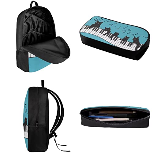 Tomeusey Schulranzen Sets, Mädchen Rucksack und Lunchbox Stifteetui 3 Packungen für Schule Reisen, Schwarze Katze mit Musiknoten, Einheitsgröße