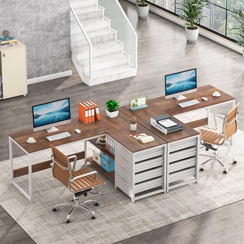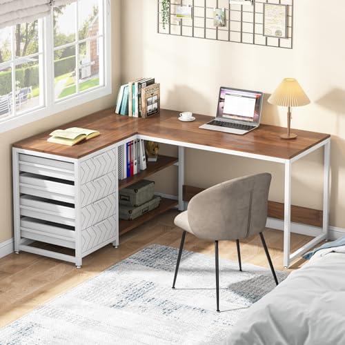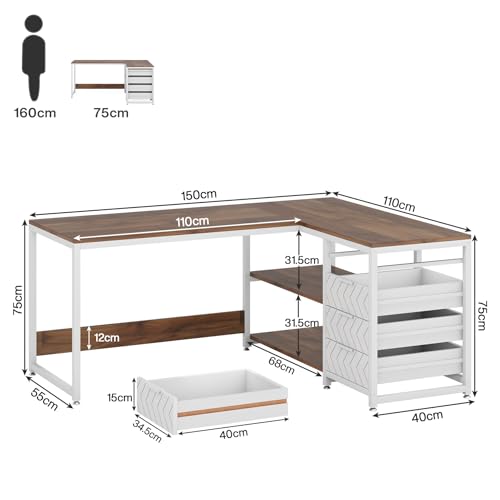 Tribesigns Schreibtisch l Form mit 4 Schubladen, L-förmiger Computertisch mit 2 Ablagen, Reversible Eckschreibtisch mit stauraum für Büro,Arbeitszimmer, Wohnzimmer,150×110×75cm (Walnuss & Weiß)