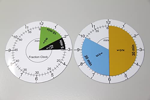 • Fraction Clock – Zeitangaben und Bruchteile; Inhalt: 2 Zifferblätter (Durchmesser 13 cm) mit je einem Stunden- und Minutenzeiger, 63 verschiedenfarbige, magnetische Bruchteile (Durchmesser 10 cm): 1/1 = 60 min, 1/2 = 30 min, 1/3 = 20 min, 1/4 = 15 min, 1/5 = 12 min, 1/6 = 10 min, 1/10 = 6 min, 1/12 = 5 min und 1/20 = 3 min
