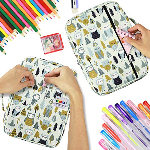 YOUSHARES Farbiges Federmäppchen mit 220 Steckplätzen, Stifte-Etui, Organizer mit praktischem Wickel und Reißverschluss, mehrlagiger Halter für Prismacolor-Buntstifte und Gel-Stifte (süße Eule)