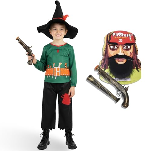 • ZJKUBOIS Räuber Kostüm Kinder, 6 Stück Kinderkostüm-Set Räuber mit Oberteil, Hose, Hut, Spielzeugpistole, Teleskop und Bart Verkleidung Set, Cosplay Bandit Karneval Faschingskostüme für Kinder (128)