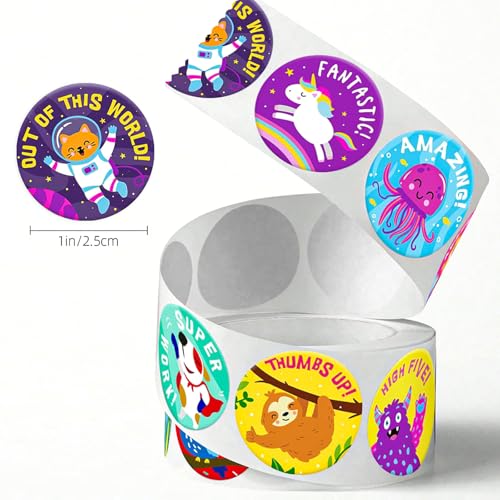 Enthält 1000 selbstklebende runde Aufkleber (2,5 cm) mit 18 verschiedenen niedlichen Tierdesigns und motivierenden Sprüchen – ideal für Kinderbelohnung.