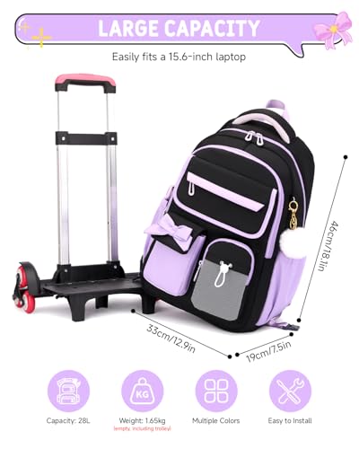 Amythe Schulrucksack Mädchen mit Rollen, 28L Abnehmbar Schulranzen Trolley für Grund- und Sekundarschule, Schultasche Teenager Lässiger Rucksack mit 6 Räder für Reisen, Schwarz Lila