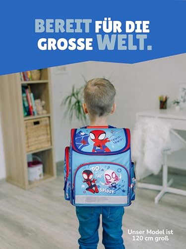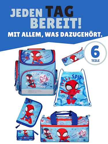 Familando – Schulranzen-Set für Spiderman Fans – Spidey & Friends – 6-teilig mit Sporttasche – Ergonomisch, stabil & mit gepolstertem Rücken – 930g leicht – 15L Volumen – Für Grundschule ab 1. Klasse