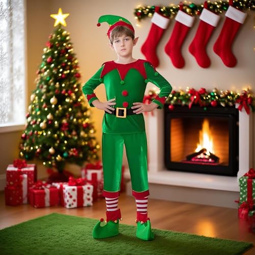 • Verwandlungsassistent: Komplettes Kinderkostüm-Set mit Jacke, Shorts, Mütze, Schuhen, Gürtel, Ohren und Streifen für ein authentisches festliches Erlebnis als Helfer von Santa Claus. Enthält 7 wesentliche Teile für das weihnachtliche Rollenspiel.