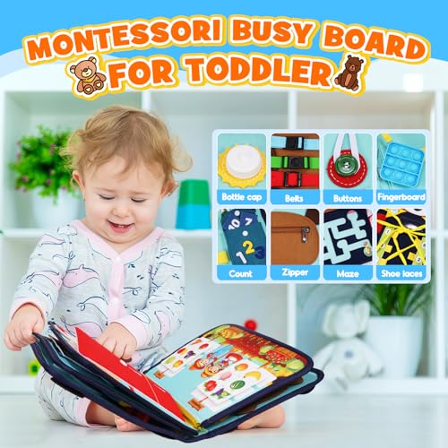 • 🐻【10 in 1 Busy Board】Dieses innovative Bär-Thema busy board enthält über 25 verschiedene Arten von Grundfertigkeiten, darunter Schnallen, Knöpfe, Reißverschlüsse, Taschen, Schnürsenkel, Flaschenverschluss und mehr sowie abnehmbare Grafiken, Datum und Zahlen. Ein Motorikspielzeug für Kinder ab 1 Jahr.