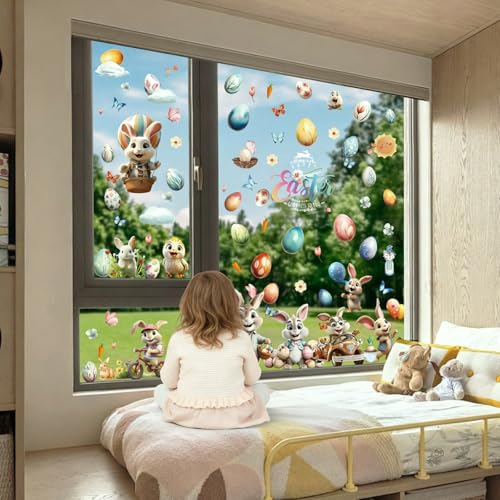 Hianjoo 130 Stück Oster-Fensteraufkleber, 9 Bögen, selbstklebend, Hase, Schmetterling, Karotte, Blume, Osterei, Osteraufkleber, Dekoration