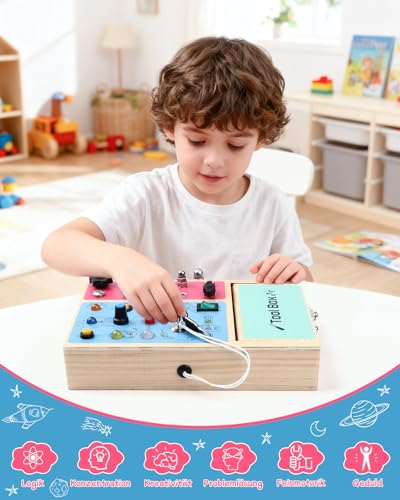 • 🌈 Pädagogisches Montessori Spielzeug ab 3 Jahre – Dieses Montessori Busy Board kombiniert Licht-, Schrauben- und Schalterelemente, um Kindern spielerisch Feinmotorik, Konzentration und logisches Denken zu fördern.