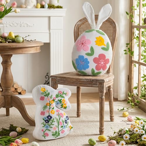 Lanpn 2 Stück Ostern Kissen, Blumenstickerei Osterhasen Kissen Ostereikissen Osternkissen Dekokissen für Sofakissen Osterdekoration für Geschenke Zuhause Party Wohnzimmer Schlafzimmer (Weiß)