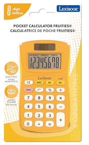 Lexibook – Taschenrechner FRUITIES®, 8 Ziffern, 4 Operationen, Grund- und erweiterte Funktionen, Solar- und Batteriebetrieb, Gelb, C208D