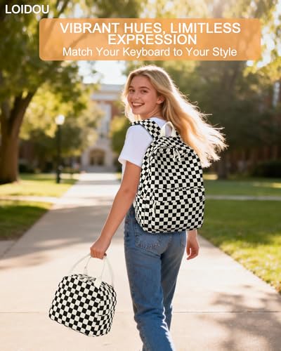 LOIDOU Rucksack für Teenager Mädchen Bookbags Kinderrucksack Kinder Schulrucksack mit Lunchpaket Federmäppchen Schulranzen Set für Schule (Schwarz-Weiß-Gitter-Set)