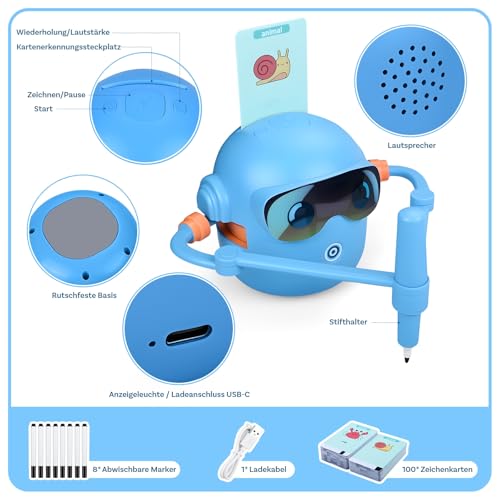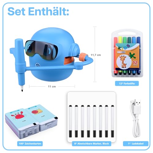 Zeichenroboter für Kinder von MMOBIEL – Malroboter Interaktives Lernspielzeug mit 100 Zeichenkarten, Sprachanleitung, 12 Farbstiften & USB-C Akku – Kreatives Geschenk für Kinder von 3–9 Jahren – Blau