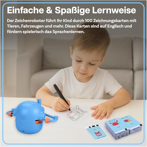 Schritt-für-Schritt-Zeichenspaß – Der Zeichenroboter führt Ihr Kind durch 100 Zeichenkarten mit Tieren, Fahrzeugen, Lebensmitteln und mehr. So wird Lernen einfach und unterhaltsam.