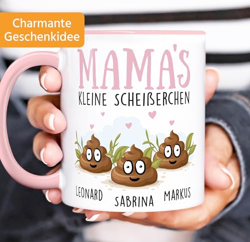 • Wenn das mal keine besonderen Grüße von Kindern an Mama sind! Lustiges Geschenk zum Muttertag oder zu Mutters Geburtstag. Kaffetasse mit bis zu 4 kleinen KackSymbols 😉 die mit Namen individualsierbar sind und witzigem Spruch "Mama's kleine Scheißerchen"