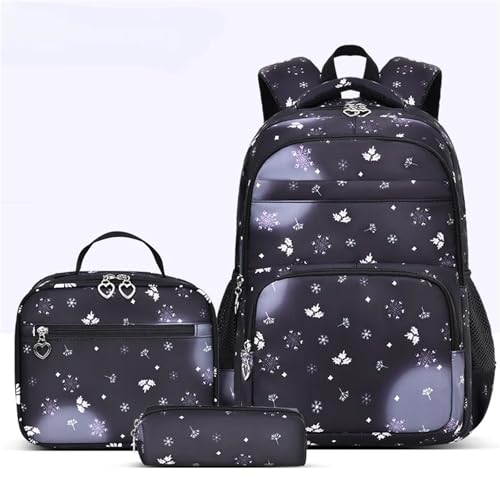 NihaoWXM Schulrucksack Set Schneeflockenmuster, dreiteiliges Schulset, Rucksack, Boxtasche, weiche Handtasche, Federmäppchen, hohe Kapazität(Purple)