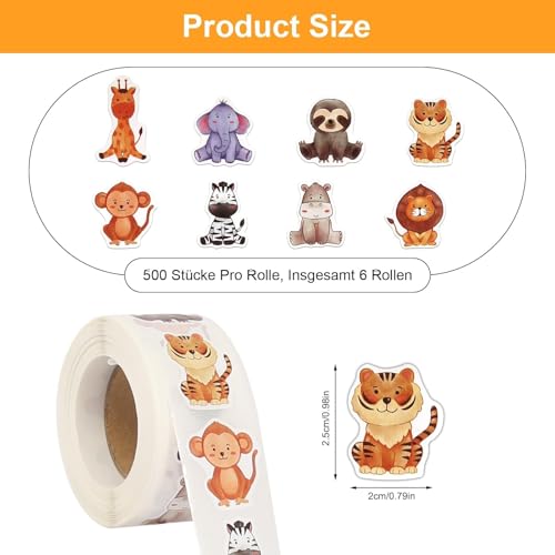 🐯【Runde Tier Sticker Set】Unser tiere sticker rolle set enthält 6 rolle mit runde tier aufkleber, jeweils mit 500 aufklebern, insgesamt 3000 stück aufkleber. Jede aufkleberrolle ist 2.8 cm / 1,1zoll, breit und hat einen durchmesser von etwa 5.5 cm / 2,2 zoll. Eine animal sticker rolle ausreichende menge reicht für Ihren bedarf.