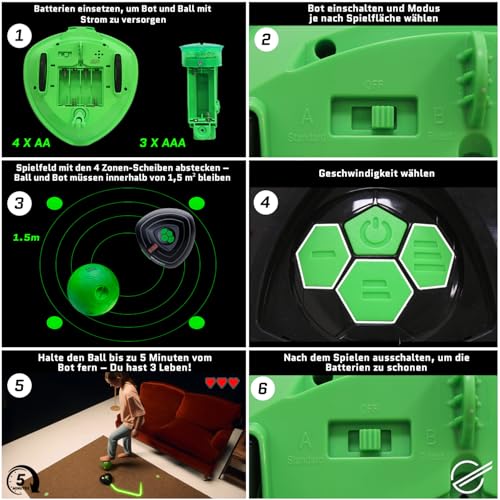 • Benötigt werden 3 AAA- und 4 AA-Batterien für Bot und Ball. Batterien sind nicht im Lieferumfang enthalten.