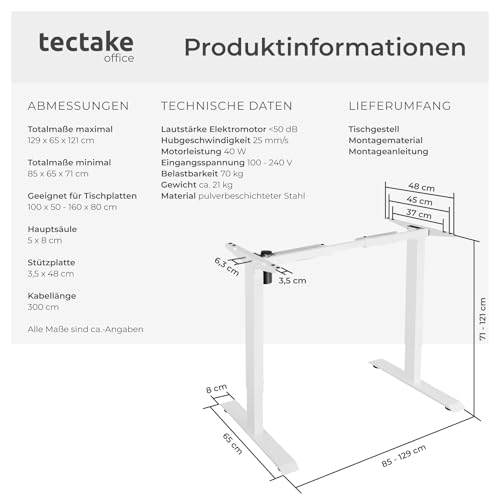 tectake® Tischgestell höhenverstellbar, Schreibtisch höhenverstellbar elektrisch, 85-129 x 65 x 71-121 cm, Variable Gestellbreite, Belastbarkeit 70 kg, Memory-Steuerung und Alarmfunktion – weiß