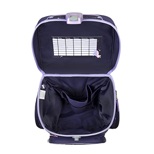 • Großes und geräumiges Hauptfach mit abgeteiltem Innenfach | zwei Seitentaschen und eine Vordertasche mit Reißverschluss für zusätzlichen Stauraum | Austauschbarer Stundenplan in der Innenseite Taschendeckel | Magnetschloss für kinderleichtes Öffnen