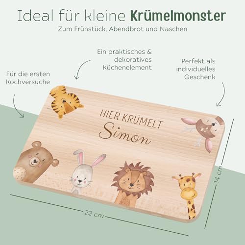 wunderwunsch – Individuelles Holzbrett mit Hochwertigem UV-Druck für Kinder – Personalisiertes Frühstücksbrettchen – Niedliche Motiv-Brettchen mit Namen und Tieren (Tiere in Ecken)