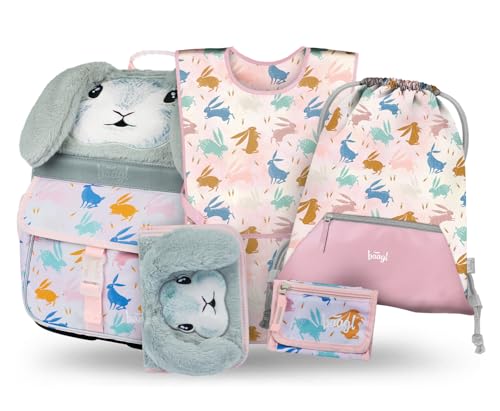 • Baagl Schulranzen Mädchen Set 5 Teilig (Zippy Schultasche für 1. Klasse, Mäppchen, Turnbeutel, Schürze, Brustbeutel), Grundschule Ranzen, Ergonomischer Schulrucksack, 18 l (Bunny)